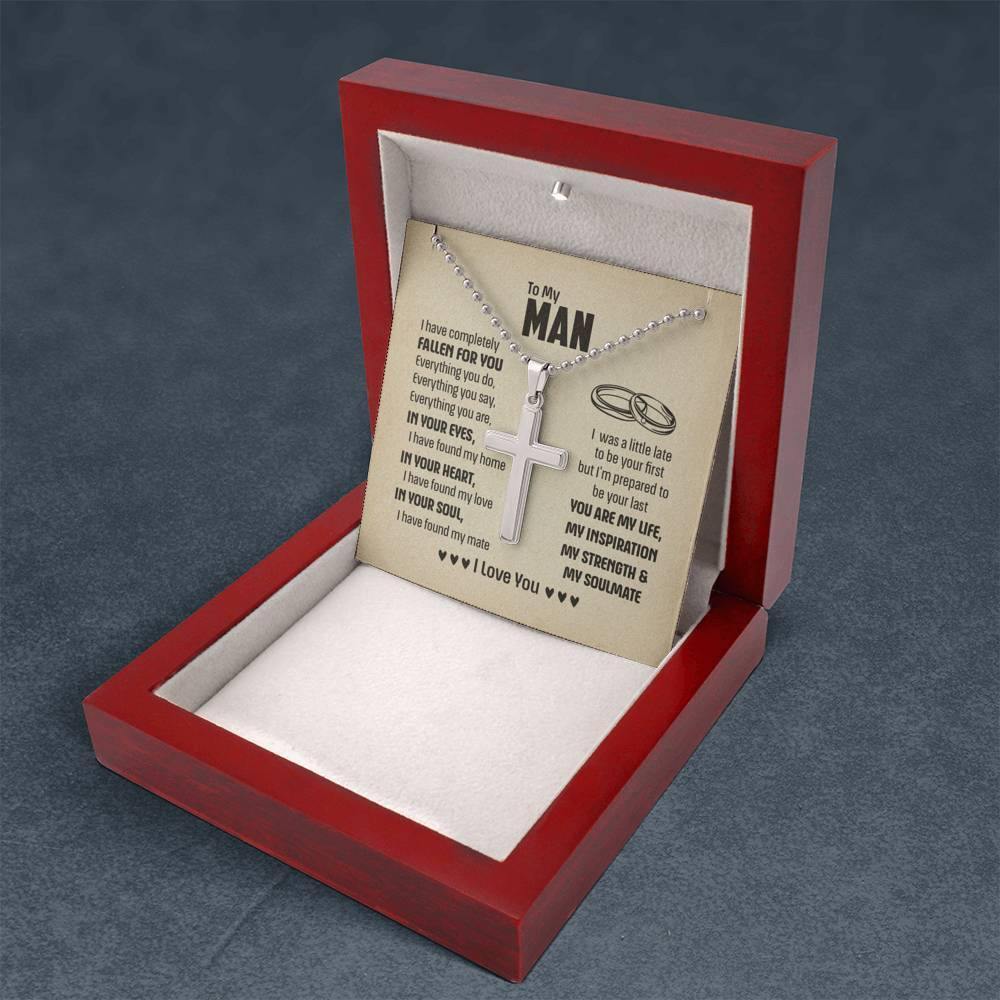 About this itemProduct details"To my Man,I have completely fallen for you.Everything you do, Everythingyou say,Everything you are, In your eyes, I found my home. In your heart, I have found my love.In your soul, I have found my soulmate.I was a little late to be your first but I'm prepared to be your last,You are my life, My inspirationMy strength & My SoulmateI love you." Wear your faith proudly with this stunning artisan-crafted Stainless Cross Necklace with Ball Chain. Perfect for special occasions or everyday wear, our Stainless Cross Necklace is a wonderful gift idea for you or your loved one. Imagine the look on their face when they open up this thoughtful gift! Sizing is appropriate for all ages and tasteful for both men and women. The artisan-crafted detail makes this pendant stand out from other cross necklaces. Includes a ball chain and attaches with an easy-to-use lobster clasp. Cross Necklace Details -Stainless Steel -Ball Chain -Lobster clasp closure -Height: 1.3" (33.5mm) -Width: 0.8" (19mm) Wear your faith proudly with this stunning artisan-crafted Stainless Steel Cross Necklace. Perfect for special occasions or everyday wear, our Cross Necklace is a wonderful gift idea for you or your loved one. Imagine the look on their face when they open up this thoughtful gift! Sizing is appropriate for all ages, and tasteful for both men and women. error:We aim to show you accurate product information. Manufacturers, suppliers and others provide what you see here, and we have not verified it. See our disclaimer