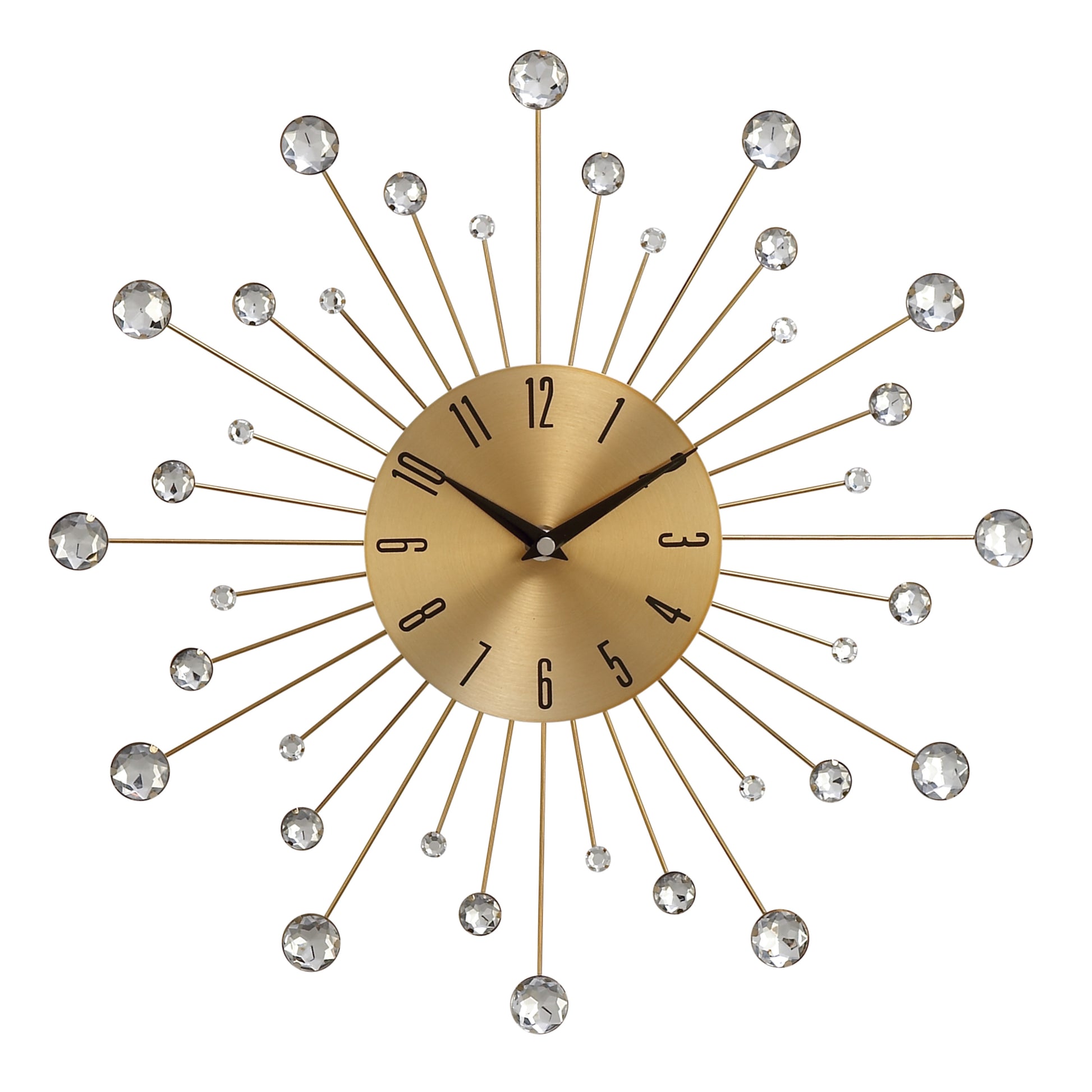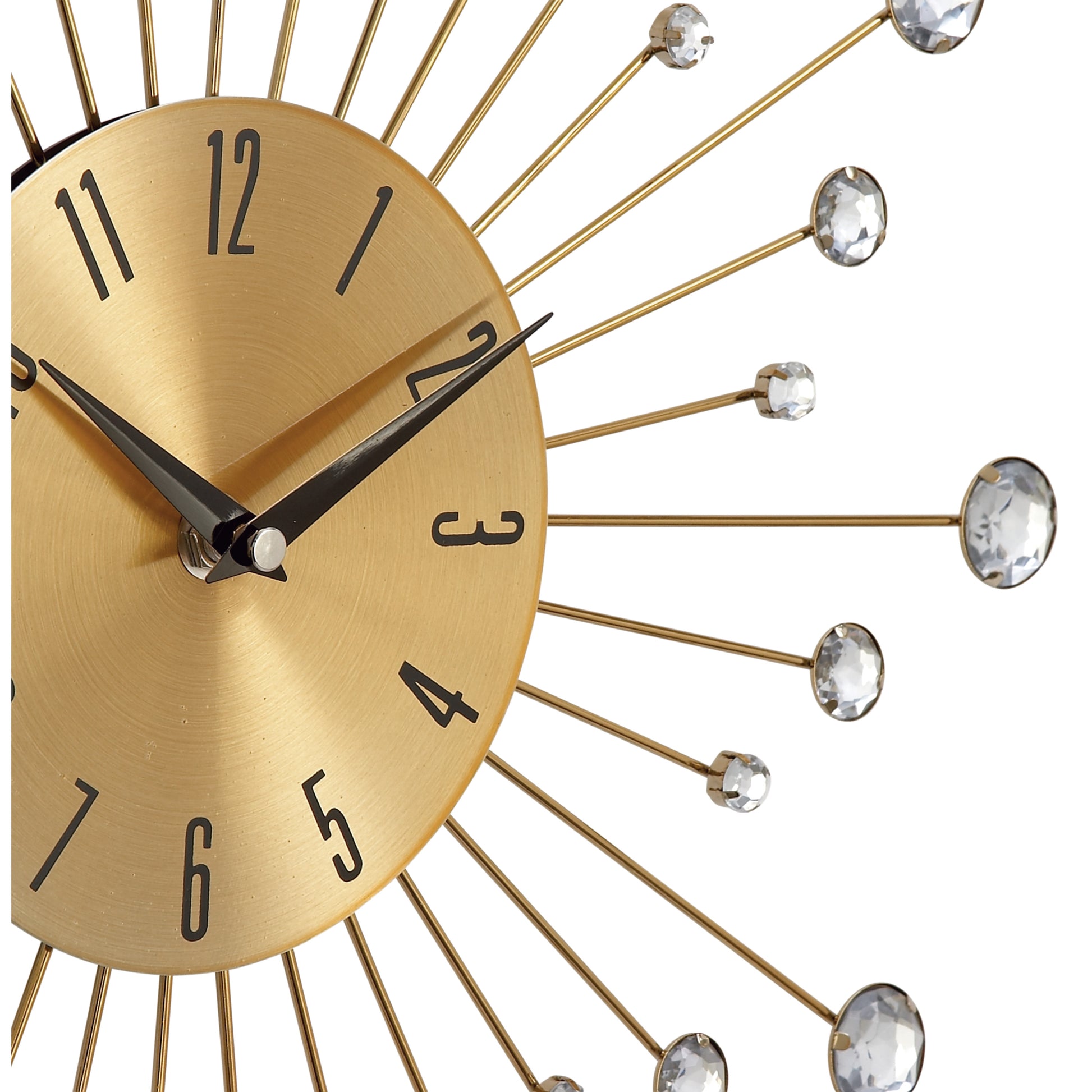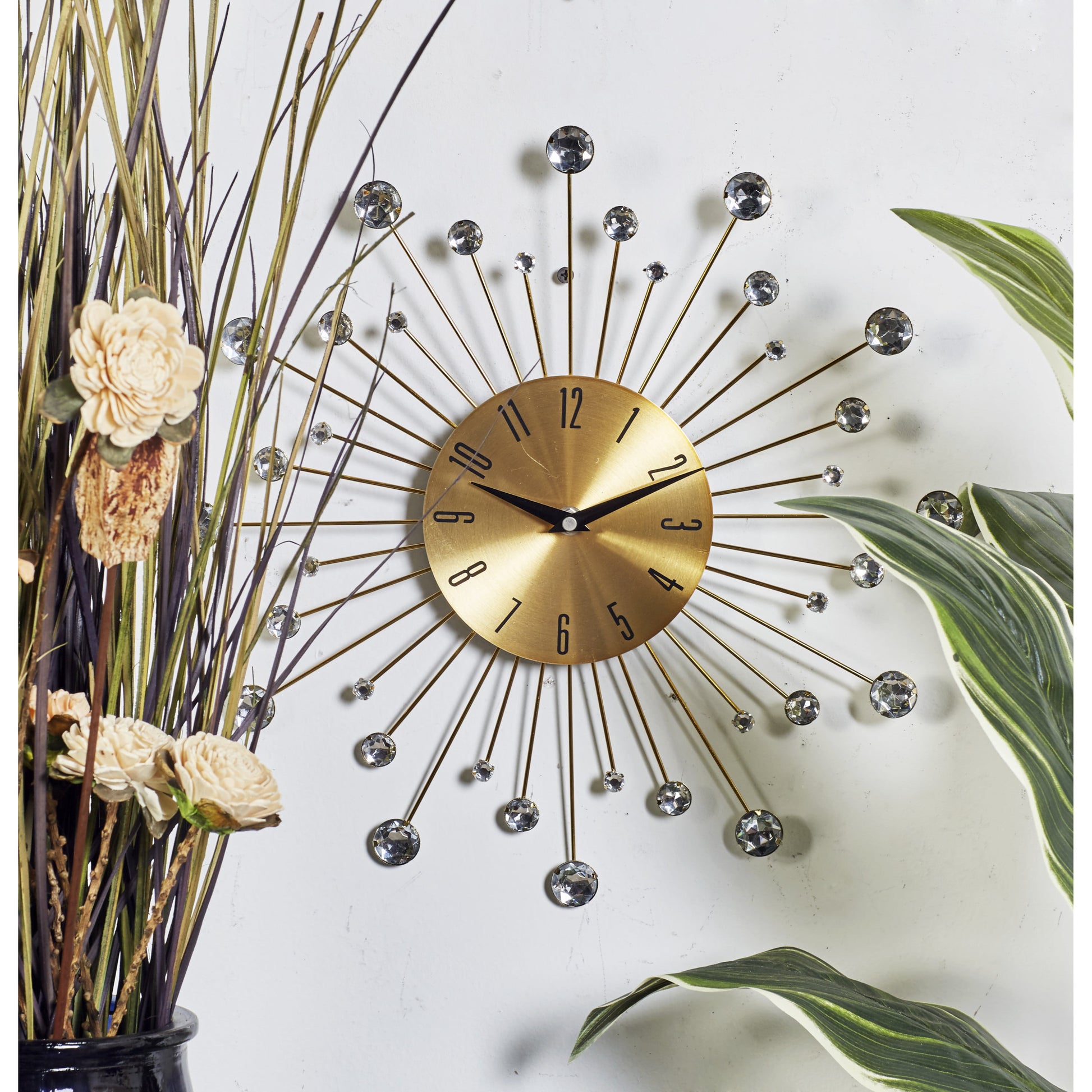 About this itemProduct detailsGive your home a luxe upgrade with this wall clock on a sleek black or muted color background. Requires 1 AA battery. Battery not included. This item ships in 1 carton. Features Arabic numerals for the hour markers. The clock mechanism runs silent. Item comes with keyhole slot in the back for a vertical hang; nails and screws are not included. Suitable for indoor use only. Glam style. DecMode 15 x 15 In. Gold Metal Glam Wall Clock Elevate your space and add a touch of luxury with this glam inspired piece Wall clock are constructed of a solid iron for durable structure Designed with gold metal rods in starburst design Features a minimalist clock face with black numerals and clock hands, gold metal rods in varying sizes and come with clear beaded tip Item measures 15”L x 0.5”W x 15”H; weighs 1.06 lbs A clock features a round starburst design with round crystal accent Wipe clean with a dry cloth Iron base with welded burst metal to form round clock with crystal accent error:We aim to show you accurate product information. Manufacturers, suppliers and others provide what you see here, and we have not verified it. See our disclaimer
