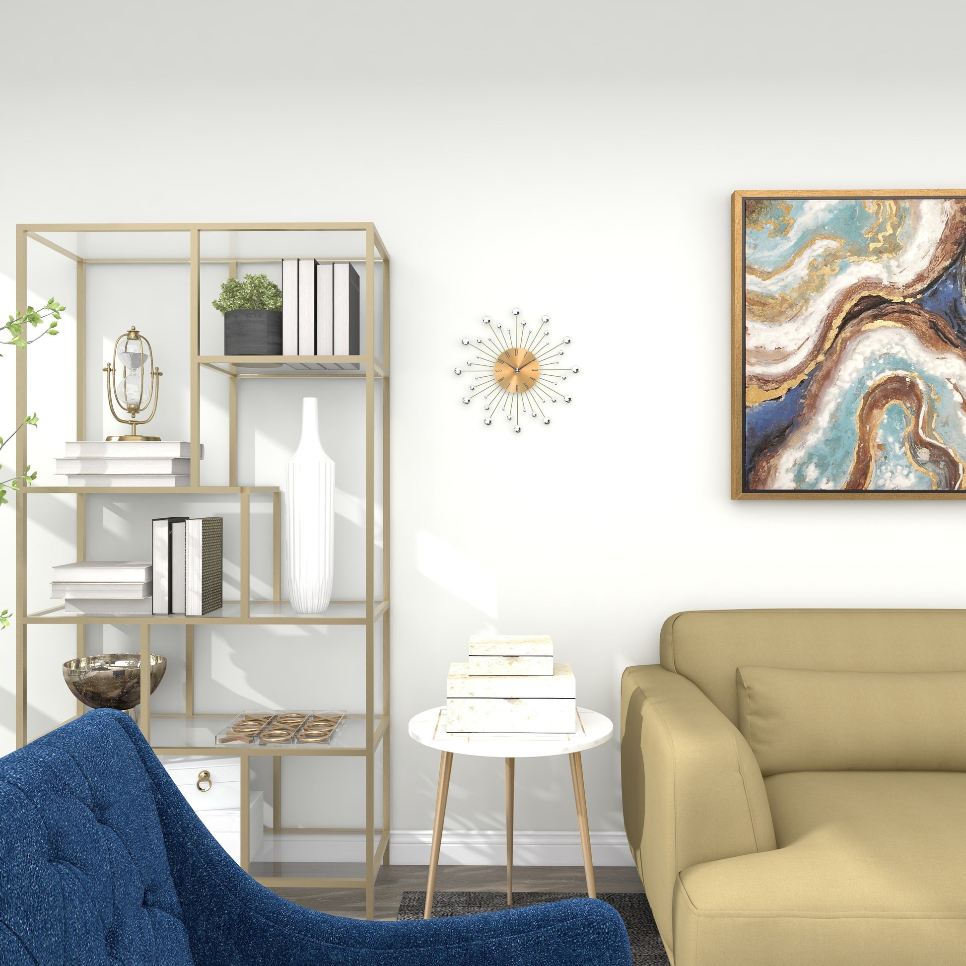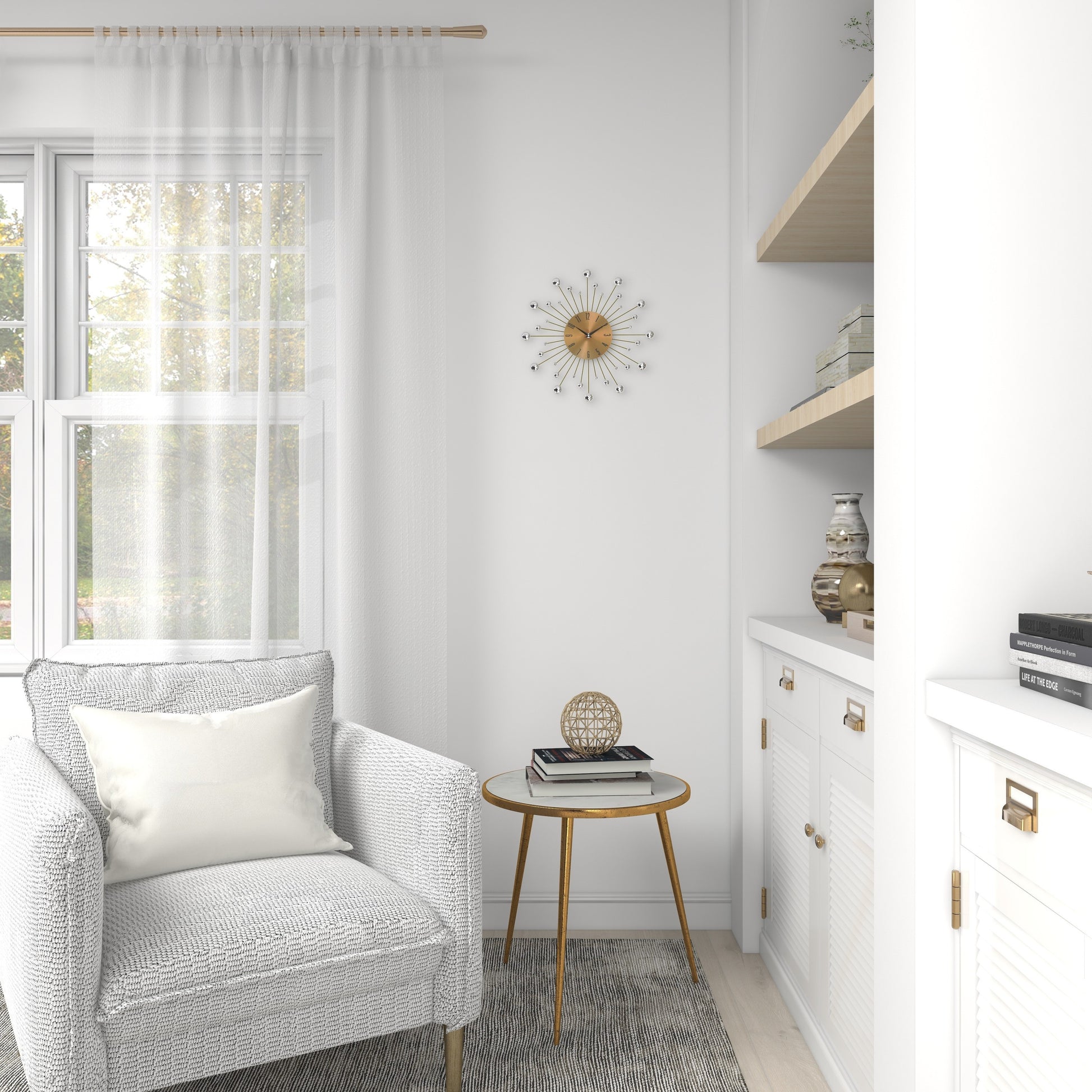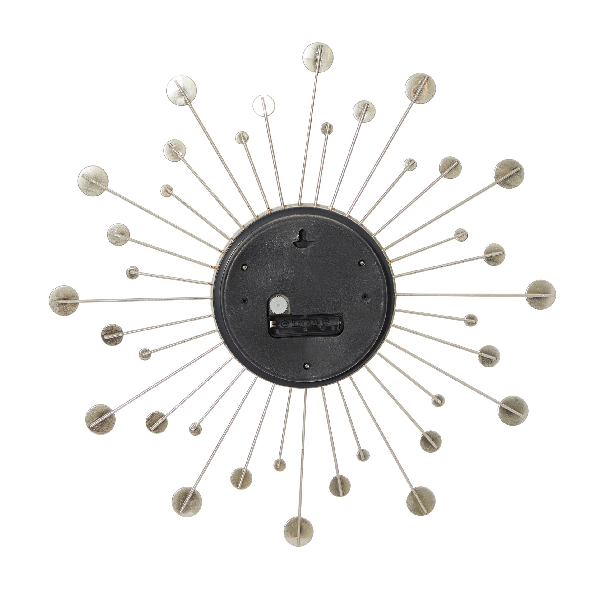 About this itemProduct detailsGive your home a luxe upgrade with this wall clock on a sleek black or muted color background. Requires 1 AA battery. Battery not included. This item ships in 1 carton. Features Arabic numerals for the hour markers. The clock mechanism runs silent. Item comes with keyhole slot in the back for a vertical hang; nails and screws are not included. Suitable for indoor use only. Glam style. DecMode 15 x 15 In. Gold Metal Glam Wall Clock Elevate your space and add a touch of luxury with this glam inspired piece Wall clock are constructed of a solid iron for durable structure Designed with gold metal rods in starburst design Features a minimalist clock face with black numerals and clock hands, gold metal rods in varying sizes and come with clear beaded tip Item measures 15”L x 0.5”W x 15”H; weighs 1.06 lbs A clock features a round starburst design with round crystal accent Wipe clean with a dry cloth Iron base with welded burst metal to form round clock with crystal accent error:We aim to show you accurate product information. Manufacturers, suppliers and others provide what you see here, and we have not verified it. See our disclaimer
