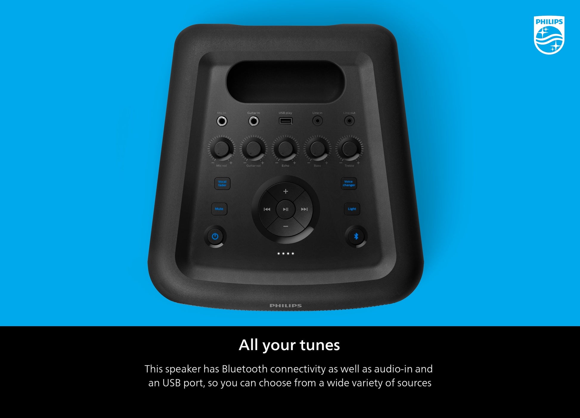 About this item Product details On the roof or across the beach, make your party heard with the Philips X3206 Bluetooth Party Speaker. This super portable Bluetooth speaker has everything you need for your next awesome party, from guitar and microphone inputs to light shows that grooves to the beat and cool karaoke effects. Charm your guests and dazzle your friends by turning up the powerful bass and taking to the dance floor. You can also play your favorite tunes through Bluetooth, or plug in an amplifier for a more dramatic effect. The rotary knobs on the speaker let you fine-tune the bass and treble, so you’re always in control of your music. Plus, the battery lasts for an impressive 14 hours, so you won’t need to worry about your speaker quitting on you. You can take it anywhere and party everywhere! Philips Portable Party Speaker, Black, X3206 GET LOUD: With 80 W maximum output and 40 W RMS, this Bluetooth speaker fills the room with powerful sound and deep, pounding bass. Just what you need to get your party started PARTY ALL DAY: The built-in battery offers 14 hours of playtime with a single charge, so you can keep the party going on all day BLAZE TO THE MUSIC: Turn on the special light effects for great party vibes. A ring of colored lights on the speaker pulses in time to the music, and there are four different lighting modes to choose from TAKE CENTER STAGE: Unleash your inner pop star with mic (6.3 mm) and guitar inputs. Both have their own volume control on the speaker, so you can change your voice, fade vocals, and add echo effects WIRED OR WIRELESS: Stream playlists through Bluetooth or connect devices via USB/audio-in. You can also plug the speaker into another speaker or amp using the line-out socket and fine-tune the bass and treble using the rotary knobs ANYTIME, ANYWHERE: The built-in carry handle and battery means you can take this speaker anywhere. Karaoke at a friend’s house or dance all night on the roof, it’s all up to you INCLUDED ACCESSORIES: AC power cord, quick start guide, warranty certificate, safety warranty sheet Specifications 2" x 2 tweeters, 8" woofer Output Power: 80W (maximum) Output power (RMS): 40W @ 1% THD Frequency response: 50Hz - 20KHz, -12dB Sound enhancement: treble and bass control, karaoke, echo control, MIC volume, vocal fader, voice changer info: We aim to show you accurate product information. Manufacturers, suppliers and others provide what you see here, and we have not verified it. See our disclaimer